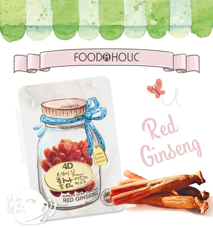 Foodaholic 4D Skinny Fit Red Ginseng Essence Mask this mask, formulated with red ginseng extract, recovers damaged skin and helps to maintain the skin healthy and glow. Red ginseng to help restore skin strength after being damaged by stress, pollution, debris and weather. If you have experienced harsh weather or environment or would like to relax after a long day of work, this mask will be sure to cure you from your troubles. Also helps maintain firmness and smoothness. Red Ginseng Mask enhances a youthful complexion by revitalizing exhausted and lifeless skin. This key ingredient is used in a lot of anti-aging skin products because it contains many substances and vitamins that help in the skin’s elasticity, vitality, and cell regeneration. Also helps in detoxifying the skin, and getting rid of free radicals that accumulate through out the day.